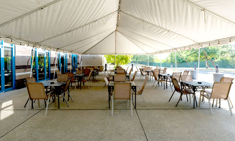 Stepping outside of the ballrooms is our covered patio. The patio tenting and seating for 48 are available, weather permitting, from May – October. If the weather is cooler the propane heaters can provide additional warmth and coziness. Soft string lighting is threaded throughout the interior of the tent to provide a warm glow. High quality metal furnishings and benches allow for a sophisticated green space that can be added to your ballroom reservations for an extra fee. Host a cigar bar or allow a place for casual outside relaxation!